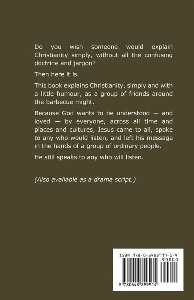 Do you wish someone would explain Christianity simply, without all the confusing doctrine?Then here it is.This book explains Christianity, simply and with a little humour, as a group of friends around the barbecue might.Because God wants to be understood - and loved - by everyone, across all time and places and cultures.Jesus came to all, spoke to any who would listen, and left his message in the hands of a group of ordinary people.He still speaks to any who will listen. Also available as a drama script.