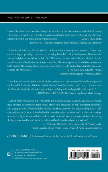 John Chandler’s Faith-Based Policy: A Litmus Test for Understanding Contemporary America provides insight into the faith-based policies of George W. Bush and Barack Obama. Chandler argues that the faith-based experiment is becoming increasingly entrenched in the institutional fabric of American government and culture and that analyzing it reveals new paradigms that explode traditional political and religious designations such as conservative–liberal and evangelical–progressive.