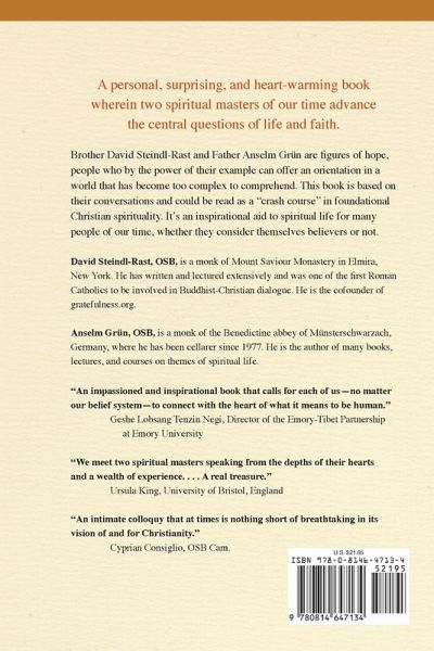 "A personal, surprising, and heart-warming book wherein two spiritual masters of our time advance the central questions of life and faith." Brother David Steindl-Rast and Father Anselm Grun are figures of hope, people who by the power of their example can offer an orientation in a world that has become too complex to comprehend. The spirituality they radiate is an everyday thing that is nevertheless both profound and vivid. . . .