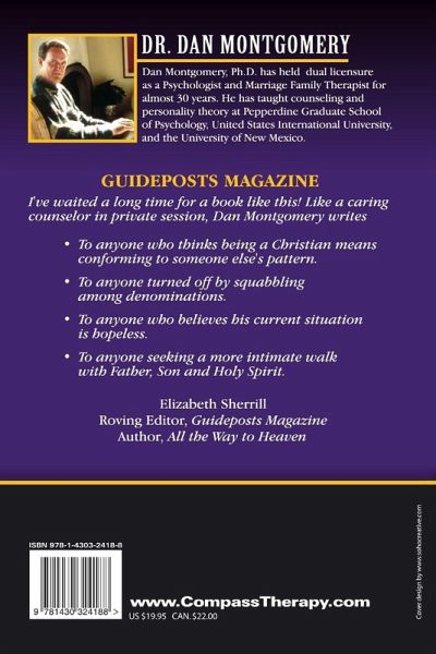 Psychologist Dan Montgomery invites you into a warm conversation about the difficulties of being human, and how simple faith can infuse your life with God's loving guidance. GUIDEPOSTS Editor Elizabeth Sherrill says, "I've waited a long time for a book like this! Like a caring counselor in private session, Dan Montgomery writes to anyone who thinks being a Christian means conforming to someone else's pattern. To anyone turned off by denominational squabbling. To anyone who believes his current situation is hopeless. To anyone seeking a more intimate walk with Father, Son and Holy Spirit." An easy read, the book nevertheless shimmers with intellectual sophistication. Theologian Gabriel Fackre writes: "Christian teaching about the Trinity becomes up close and personal in this engaging work by a wise counselor. Here is enriching daily guidance from Compass Therapy for our pilgrimage with the triune God."