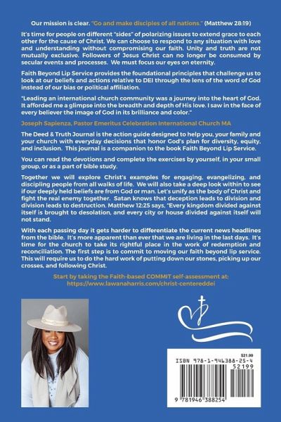 It's time for people on different "sides" of polarizing issues to extend grace to each other for the cause of Christ. We can choose to respond to any situation with love and understanding without compromising our faith. Unity and truth are not mutually exclusive. Followers of Jesus Christ can no longer be consumed by secular events and processes. We must focus our eyes on eternity. Faith Beyond Lip Service provides the foundational principles that challenge us to look at our beliefs and actions relative to DEI through the lens of the word of God instead of our bias or political affiliation. "Leading an international church community was a journey into the heart of God. It afforded me a glimpse into the breadth and depth of His love. I saw in the face of every believer the image of God in its brilliance and color." Joseph Sapienza Pastor Emeritus Celebration International Church MA The Deed & Truth Journal is the action guide designed to help you, your family and your church with everyday decisions that honor God's plan for diversity, equity, and inclusion. This journal is a companion to the book Faith Beyond Lip Service. You can read the devotions and complete the exercises by yourself, in your small group, or as a part of bible study. Together we will explore Christ's examples for engaging, evangelizing, and discipling people from all walks of life. We will also take a deep look within to see if our deeply held beliefs are from God or man. Let's unify as the body of Christ and fight the real enemy together. Satan knows that deception leads to division and division leads to destruction. Matthew 12:25 says, "Every kingdom divided against itself is brought to desolation, and every city or house divided against itself will not stand. With each passing day it gets harder to differentiate the current news headlines from the bible. It's more apparent than ever that we are living in the last days. It's time for the church to take its rightful place in the work of redemption and reconciliation. The first step is to commit to moving our faith beyond lip service. This will require us to do the hard work of putting down our stones, picking up our crosses, and following Christ. Start by taking the Faith-based COMMIT self-assessment at: https://www.lawanaharris.com/christ-centereddei Our mission is clear. "Go and make disciples of all nations." (Matthew 28:19)