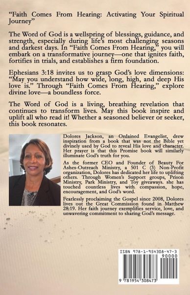 "during life's most challenging seasons and darkest days. In "Faith Comes FromHearing," you will embark on a transformative journey-one that ignites faith,fortifies in trials, and establishes a firm foundation. Ephesians 3:18 invites us to grasp God's love dimensions: "May you understandhow wide, long, high, and deep His love is." Through "Faith Comes FromHearing," explore divine love-a boundless force. The Word of God is a living, breathing revelation that continues to transform lives.May this book inspire and uplift all who read it! Whether a seasoned believer orseeker, this book resonates. Artist Bio Dolores Jackson, an Ordained Evangelist, drew inspiration from a book that was not the Bible yet divinely used by God to reveal His love and character. Her prayer is that this Promise book will similarly illuminate God's truth for you. As the former CEO and Founder of Beauty For Ashes-Outreach Ministry, a 501 C (3) Non-Profit organization, Dolores has dedicated her life to uplifting others. Through Women's Support groups, Prison Ministry, Park Ministry, and Toy giveaways. she has touched countless lives with compassion, hope, encouragement, and God's word. Fearlessly proclaiming the Gospel since 2008, Dolores lives out the Great Commission found in Matthew 28:19. Her faith journey exemplifies service, love, and unwavering commitment to sharing God's message..