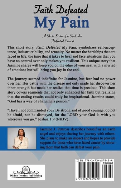 This short story, Faith Defeated My Pain, symbolizes self-acceptance, indestructibility, and tenacity. No matter the hardships that are faced in life, the time that it takes to heal and face situations that you have no control over only makes you resilient. This unique story that Jasmine shares will keep you on the edge of your seat with a myriad of emotions but will bring you joy in the end. The journey seemed indefinite for Jasmine, but fear had no power over her. Her battle with the disease not only made her discover her inner strength but made her realize that time is precious. This short story covers segments that not only enhanced her faith but realizing that the ending results could truly be inspirational. Jasmine states, "God has a way of changing a person." "Have I not commanded you? Be strong and of good courage, do not be afraid, nor be dismayed, for the LORD your God is with you wherever you go." Joshua 1:9 (NKJV) Jasmine J. Pettross describes herself as an earth angel and enjoys sharing her journey with others. She plans to make an impact and hopes to provide support for those who have faced cancer by showing them that faith can defeat your pain.