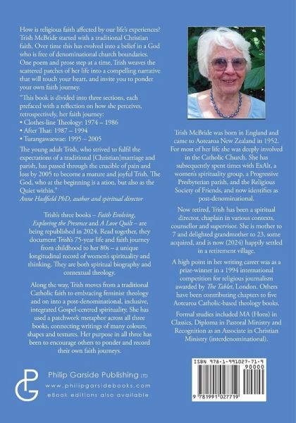 How is religious faith affected by our life's experiences? Trish McBride started with a traditional Christian faith. Over time this has evolved into a belief in a God who is free of denominational church boundaries. One poem and prose step at a time, Trish weaves the scattered patches of her life into a compelling narrative that will touch your heart, and invite you to ponder your own faith journey. "This book is divided into three sections, each prefaced with a reflection on how she perceives, retrospectively, her faith journey: Clothes-line Theology: 1974-1986 After That: 1987-1994 Turangawaewae: 1995-2005 The young adult Trish, who strived to fulfil the expectations of a traditional [Christian] marriage and parish, has passed through the crucible of pain and loss by 2005 to be-come a mature and joyful Trish. The God, who at the beginning is a demanding figure evoking total blind surrender, is by the end the One who seeks justice in solidarity with marginalised women and men, and who manifests not only in creation, but also as the Quiet within." Anne Hadfield PhD, author and spiritual director "My purpose in assembling the first edition of Faith Evolving was two-fold: to fill a gap in the spirituality literature by offering a sample longitudinal study of an ordinary woman's journey of faith, and to encourage readers to reflect on their own journeys. This edition has the same aims! The hard times are well and truly over and life is enjoyable and mostly peaceful. Good health helps with that, as do plentiful silence, solitude and simplicity - and more quilt-making. Another ten grandchildren have come along, all delicious buds on the family tree. For me now God permeates everything as Life-Force, and is personally communicating and relational in Jesus, my life companion, and is Holy Mystery. Perhaps this approaches what the Church Fathers were trying to get at when they defined the Trinity!" Trish, From the Preface to the Third edition (2016) Trish's three books - Faith Evolving, Exploring the Presence and A Love Quilt - are being republished in 2024. Read together, they document Trish's 75-year life and faith journey from childhood to her 80s - a unique longitudinal record of women's spirituality and thinking. They are both spiritual biography and contextual theology. Along the way, Trish moves from a traditional Catholic faith to embracing feminist theology and on into a post-denominational, inclusive, integrated Gospel-centred spirituality. She has used a patchwork metaphor across all three books, connecting writings of many colours, shapes and textures. Her purpose in all three has been to encourage others to ponder and record their own faith journeys.