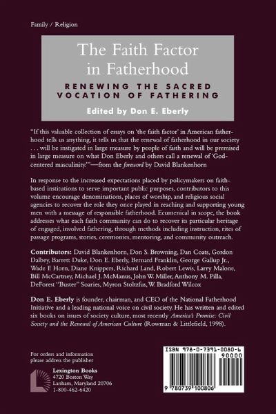 Edited by founder and chairman of the National Fatherhood Initiative Don Eberly, The Faith Factor in Fatherhood addresses the key role that religious institutions can play in reviving what Eberly calls the 'sacred vocation of fatherhood.' In response to the wider debate regarding the increased expectations that are being placed by policy makers on faith-based institutions to serve important public purposes, contributors to this volume guide denominations, places of worship, and religious social agencies to recover the role they once played in reaching and supporting young men with a message of responsible fatherhood. Ecumenical in scope, the book addresses what each faith community can do to recover its particular heritage of engaged, involved fathering, through methods including instruction, rites of passage programs, stories, ceremonies, mentoring, and community outreach.