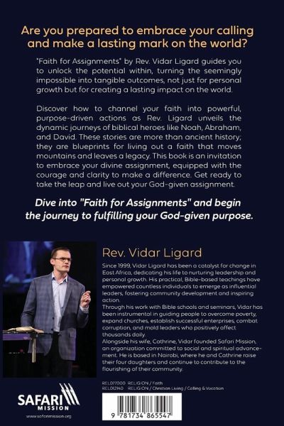 Are you prepared to embrace your calling and make a lasting mark on the world? "Faith for Assignments" by Rev. Vidar Ligard guides you to unlock the potential within, turning the seemingly impossible into tangible outcomes, not just for personal growth but for creating a lasting impact on the world. Discover how to channel your faith into powerful, purpose-driven actions as Rev. Ligard unveils the dynamic journeys of biblical heroes like Noah, Abraham, and David. These stories are more than ancient history; they are blueprints for living out a faith that moves mountains and leaves a legacy. This book is an invitation to embrace your divine assignment, equipped with the courage and clarity to make a difference. Get ready to take the leap and live out your God-given assignment. Dive into "Faith for Assignments" and begin the journey to fulfilling your God-given purpose.