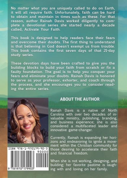 No matter what you are uniquely called to do on Earth, it will all require faith. Unfortunately, faith can be hard to obtain and maintain in times such as these. For that reason, author Rainah Davis worked diligently to complete a devotional series she started nearly a decade called, Activate Your Faith. This book is designed to help readers face their fears and overcome their doubts. The first thing to understand is that believing in God doesn't exempt us from trouble. This book contains the first seven days of that 21-day study series. These devotion days have been crafted to give you the building blocks to build your faith from scratch or fix a faulty foundation. The goal is to help you conquer your fears and eliminate your doubts. Rainah Davis is honored to serve as your professor, exhorter, and coach through the process, and she encourages you to consider reading the entire series.