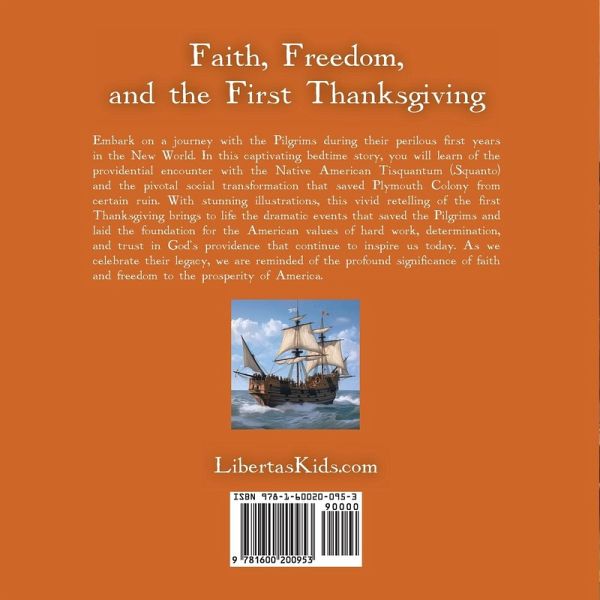 Embark on a journey with the Pilgrims during their perilous first years in the New World. In this captivating bedtime story, you will learn of the providential encounter with the Native American Tisquantum (Squanto) and the pivotal social transformation that saved Plymouth Colony from certain ruin. With stunning illustrations, this vivid retelling of the first Thanksgiving brings to life the dramatic events that saved the Pilgrims and laid the foundation for the American values of hard work, determination, and trust in God's providence that continue to inspire us today. As we celebrate their legacy, we are reminded of the profound significance of faith and freedom to the prosperity of America.