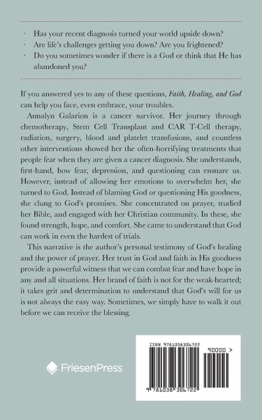 ¿ Has your recent diagnosis turned your world upside down? ¿ Are life's challenges getting you down? Are you frightened? ¿ Do you sometimes wonder if there is a God or think that He has abandoned you? If you answered yes to any of these questions, Faith, Healing, and God can help you face, even embrace, your troubles. Annalyn Galarion is a cancer survivor. Her journey through chemotherapy, stem-cell and CAR T-cell transplants, radiation, surgery, blood and platelet transfusions, and countless other interventions showed her the often-horrifying treatments that people fear when they are given a cancer diagnosis. She understands, first-hand, how fear, depression, and questioning can ensnare us. However, instead of allowing her emotions to overwhelm her, she turned to God. Instead of blaming God or questioning His goodness, she clung to God's promises. She concentrated on prayer, studied her Bible, and engaged with her Christian community. In these, she found strength, hope, and comfort. She came to understand that God can work in even the hardest of trials. This narrative is the author's personal testimony of God's healing and the power of prayer. Her trust in God and faith in His goodness provide a powerful witness that we can combat fear and have hope in any and all situations. Her brand of faith is not for the weak-hearted; it takes grit and determination to understand that God's will for us is not always the easy way. Sometimes, we simply have to walk it out before we can receive the blessing.