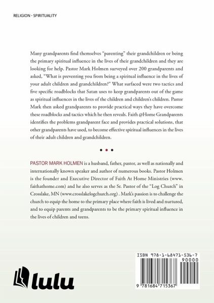 Many grandparents find themselves "parenting" their grandchildren or being the primary spiritual influence in the lives of their grandchildren and they are looking for help. Pastor Mark Holmen surveyed over 200 grandparents and asked, "What is preventing you from being a spiritual influence in the lives of your adult children and grandchildren?" What surfaced were two tactics and five specific roadblocks that Satan uses to keep grandparents out of the game as spiritual influences in the lives of the children and children's children. Pastor Mark then asked grandparents to provide practical ways they have overcome these roadblocks and tactics which he then reveals. Faith @Home Grandparents identifies the problems grandparent face and provides practical solutions, that other grandparents have used, to become effective spiritual influences in the lives of their adult children and grandchildren.