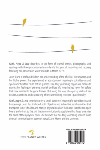Faith, Hope & Love describes - in the form of journal entries, photographs, and readings with three psychics/mediums - Jenn's first year of mourning and recovery, following her partner Ann Marie's suicide in March 2019. Jenn found a profound shift in her understanding of the afterlife, the Universe, and her higher power. She experienced an abundance of meaningful coincidences and synchronicities that could not be ignored. Her daily journaling began as a means to express her feelings of extreme anguish and loss of a love she had never felt before that now seemed to be gone forever. But, along the way she quickly realized her desires, questions, and outpouring of love was being returned - quite literally. Faith, Hope & Love chronicles only a small portion of meaningful coincidences and happenings. Jenn has included both objective and subjective synchronicities that transpired in her life after Ann Marie's physical death in the hopes that she can open hearts and minds to the fact that communication is possible with a loved one after the death of the physical body. She believes that her daily