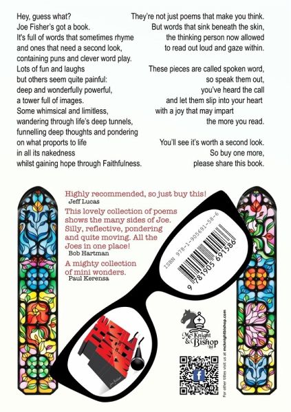 Hey, guess what? Joe Fisher's got a book. It's full of words that sometimes rhyme and ones that need a second look, containing puns and clever word play. Lots of fun and laughs but others seem quite painful: deep and wonderfully powerful, a tower full of images. Some whimsical and limitless, wandering through life's deep tunnels, funnelling deep thoughts and pondering on what proports to life in all its nakedness whilst gaining hope through Faithfulness. They're not just poems that make you think. But words that sink beneath the skin, the thinking person now allowed to read out loud and gaze within. These pieces are called spoken word, so speak them out, you've heard the call and let them slip into your heart with a joy that may impart the more you read. You'll see it's worth a second look. So buy one more, please share this book.