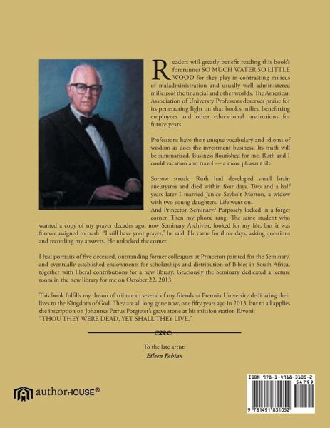 Readers will greatly benefit reading this book's forerunner SO MUCH WATER SO LITTLE WOOD for they play in contrasting milieus of maladministration and usually well administered milieus of the financial and other worlds. The American Association of Universty Professors deserves praise for its penetrating light on that book's milieu benefitting employees and other educational institutions for future years. Professions have their unique vocabulary and idioms of wisdom as does the investment business. Its truth will be summarized. Business flourished for me. Ruth and I could vacation and travel - a more pleasant life. Sorrow struck. Ruth had developed small brain aneurysms and died within four days. Two and a half years later I married Janice Seybolt Morton, a widow with two young daughters. Life went on. And Princeton Seminary? Purposely locked in a forget corner. Then my phone rang. The same student who wanted a copy of my prayer decades ago, now Seminary Archivist, looked for my file, but it was forever assigned to trash. "I still have your prayer," he said. He came for three days, asking questions and recording my answers. He unlocked the corner. I had portraits of five deceased, outstanding former colleagues at Princeton painted for the Seminary, and eventually established endowments for scholarships and distribution of Bibles in South Africa, together with liberal contributions for a new library. Graciously the Seminary dedicated a lecture room in the new library for me on October 22, 2013. This book fulfills my dream of tribute to several of my friends at Pretoria University dedicating their lives to the Kingdom of God. They are all long gone now, one fifty years ago in 2013, but to all applies the inscription on Johannes Petrus Potgieter's grave stone at his mission station Rivoni: "THOU THEY WERE DEAD, YET SHALL THEY LIVE."