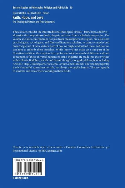 These essays consider the three traditional theological virtues-faith, hope, and love-alongside their opposites-doubt, despair, and hate, from a scholarly perspective. The volume includes contributions not just from philosophers of religion, but also from psychologists, sociologists, and film and literature scholars, to paint a complex and nuanced picture of these virtues, both of how we might understand them, and how we can hope to embody them ourselves. While these virtues make up a core part of the Christian tradition, the chapters here go far and wide in search of different cultural conceptions of these universal human concerns. Inquiries are made into these virtues within Hindu, Buddhist, Jewish, and Islamic thought, alongside philosophers including Aristotle, Hegel, Kierkegaard, Nietzsche, Levinas, and Murdoch. The resulting tapestry is often beautiful, sometimes horrific, but always thoroughly human. This text appeals to students and researchers working in these fields. Chapter [9] is available open access under a Creative Commons Attribution 4.0 International License via link.springer.com.