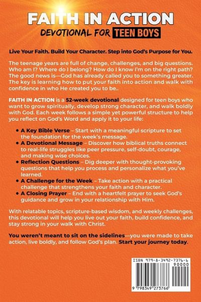 Live Your Faith. Build Your Character. Step into God's Purpose for You. The teenage years are full of change, challenges, and big questions. Who am I? Where do I belong? How do I know I'm on the right path? The good news is-God has already called you to something greater. The key is learning how to put your faith into action and walk with confidence in who He created you to be.. Faith in Action is a 52-week devotional designed for teen boys who want to grow spiritually, develop strong character, and walk boldly with God. Each week follows a simple yet powerful structure to help you reflect on God's Word and apply it to your life:A Key Bible Verse - Start with a meaningful scripture to set the foundation for the week's message. A Devotional Message - Discover how biblical truths connect to real-life struggles like peer pressure, self-doubt, courage, and making wise choices. Reflection Questions - Dig deeper with thought-provoking questions that help you process and personalize what you've learned. A Challenge for the Week - Take action with a practical challenge that strengthens your faith and character. A Closing Prayer - End with a heartfelt prayer to seek God's guidance and grow in your relationship with Him. With relatable topics, scripture-based wisdom, and weekly challenges, this devotional will help you live out your faith, build confidence, and stay strong in your walk with Christ.