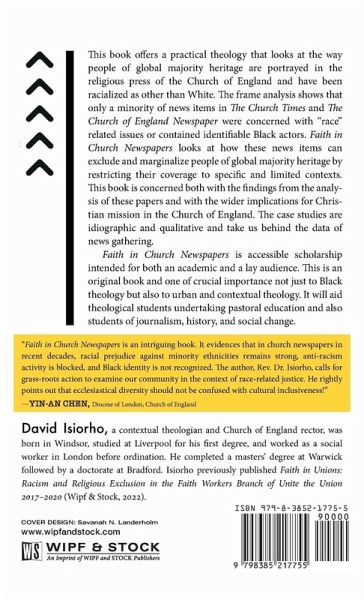 This book offers a practical theology that looks at the way people of global majority heritage are portrayed in the religious press of the Church of England and have been racialized as other than White. The frame analysis shows that only a minority of news items in The Church Times and The Church of England Newspaper were concerned with ""race"" related issues or contained identifiable Black actors. Faith in Church Newspapers looks at how these news items can exclude and marginalize people of global majority heritage by restricting their coverage to specific and limited contexts. This book is concerned both with the findings from the analysis of these papers and with the wider implications for Christian mission in the Church of England. The case studies are idiographic and qualitative and take us behind the data of news gathering. Faith in Church Newspapers is accessible scholarship intended for both an academic and a lay audience. This is an original book and one of crucial importance not just to Black theology but also to urban and contextual theology. It will aid theological students undertaking pastoral education and also students of journalism, history, and social change.