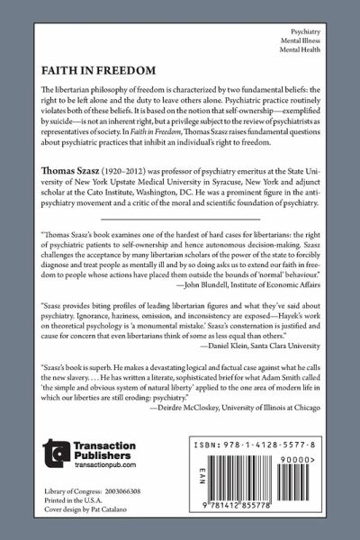 The libertarian philosophy of freedom is characterized by two fundamental beliefs: the right to be left alone and the duty to leave others alone. Psychiatric practice routinely violates both of these beliefs. It is based on the notion that self-ownership-exemplified by suicide-is a not an inherent right, but a privilege subject to the review of psychiatrists as representatives of society. In Faith in Freedom, Thomas Szasz raises fundamental questions about psychiatric practices that inhibit an individual's right to freedom. His questions are fundamental. Is suicide an exercise of rightful self-ownership or a manifestation of mental disorder? Does involuntary confinement under psychiatric auspices constitute unjust imprisonment, or is it therapeutically justified hospitalization? Should forced psychiatric drugging be interpreted as assault and battery on the person or is it medical treatment? The ethical standards of psychiatric practice mandate that psychiatrists employ coercion. Forgoing such "intervention" is considered a dereliction of the psychiatrists' "duty to protect." How should friends of freedom-especially libertarians-deal with the conflict between elementary libertarian principles and prevailing psychiatric practices? In Faith in Freedom, Thomas Szasz addresses this question more directly and more profoundly than in any of his previous works.