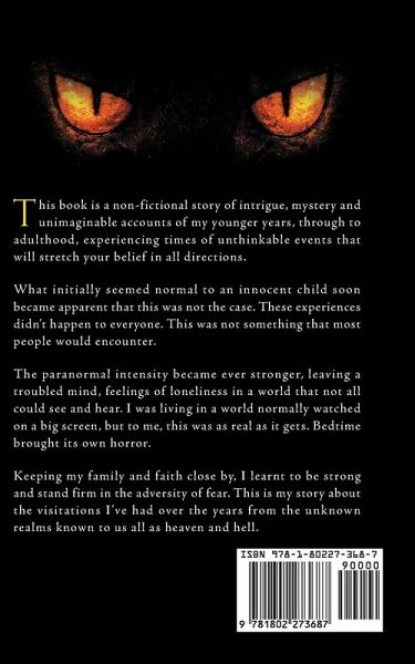 A prevailing light over darkness. This book is a non-fictional story of intrigue, mystery and unimaginable accounts of my younger years, through to adulthood, experiencing times of unthinkable events that will stretch your belief in all directions. What initially seemed normal to an innocent child soon became apparent that this was not the case. These experiences didn't happen to everyone. This was not something that most people would encounter. The paranormal intensity became ever stronger, leaving a troubled mind, feelings of loneliness in a world that not all could see and hear. I was living in a world normally watched on a big screen, but to me, this was as real as it gets. Bedtime brought its own horror. Keeping my family and faith close by, I learnt to be strong and stand firm in the adversity of fear. This is my story about the visitations I've had over the years from the unknown realms known to us all as heaven and hell.