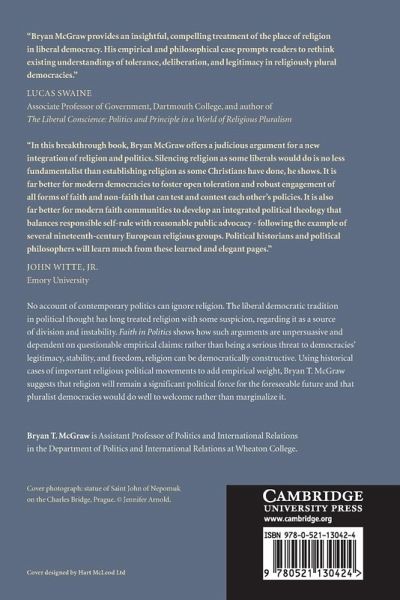 No account of contemporary politics can ignore religion. The liberal democratic tradition in political thought has long treated religion with some suspicion, regarding it as a source of division and instability. Faith in Politics shows how such arguments are unpersuasive and dependent on questionable empirical claims: rather than being a serious threat to democracies' legitimacy, stability and freedom, religion can be democratically constructive. Using historical cases of important religious political movements to add empirical weight, Bryan McGraw suggests that religion will remain a significant political force for the foreseeable future and that pluralist democracies would do well to welcome rather than marginalize it. Religion is often thought to be a serious threat to democracies' legitimacy, stability and freedom. Faith in Politics argues that religion can be democratically constructive and that arguments offered to the contrary are unpersuasive and dependent on questionableempirical claims.