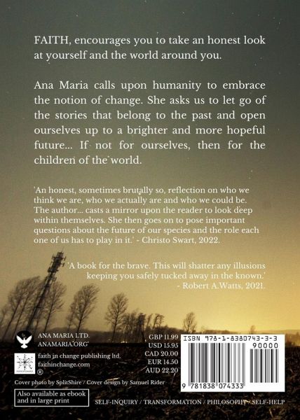 FAITH, encourages you to take an honest look at yourself and the world around you. Ana Maria calls upon humanity to embrace the notion of change. She asks us to let go of the stories that belong to the past and open ourselves up to a brighter and more hopeful future... If not for ourselves, then for the children of the world. Excerpt from Preface: A meandering waltz through time and space, we begin to pick apart what it means to be human. We dissect and decode the ways in which we are programmed to present as this individual self and are asked to embrace the notion of change. In ignorance we dwell no longer, as we learn to harness the Revolution of Knowledge that we find ourselves experiencing as a species. If new and different call you forth into the unknown, then I invite you to join me in untangling yourself from the world, as it seems timely for the human collective to slowly begin defining exactly what it is that we are, and to start admitting more to the truth of ourselves. It is time for a wake-up call and what better alarm bell to ring than that of reality? Our species is made up of stories, we are defined as well as contained by them, and somewhat scared of letting them go. Our identities are entangled by what we think we know, so really, what we are scared of is a loss of our egoic selves, not the silly and often harmful stories that we cling to. Herein, we slowly uncover the truth of who you are and who there is still a chance to become. I do not talk here about improving yourself, much better to accept yourself and embrace the full, whole and colourful human that you were born to be. We must stop living in fear of our own humanness, we must stop smothering the truth of ourselves in shame and denial if we are to move forwards as a humanity. We are all a bit fudged up, can we just let that be okay now? It is the wellness of our children that concerns me the most, what their futures look like, what their prospects are for a happy life lived well and expansively. With a matrix of information available at the touch of a fingertip, it is time to start discerning the truth from the lies if our children are to have any chance at surviving this mad house they are soon to inherit. I spent a long time delving into the past to make way for a better future for myself, and now I'd like to share what I found with the rest of the world... FAITH. Excerpt from poem titled, Don't Be Scared: Don't be scared dear ones, Welcome the thought of change. Open up your minds and hearts, To the idea of a New Age. It is with children in mind that I speak, With their health and wellbeing at heart. In light of how disconnected we've come to be, How far from the truth we're seemingly apart. There is no answer I can provide, To ease your discomfort, sorrow or pain. There is no trick, no miracle pill, Nothing to justify, reason or name. I have no god to offer you, No deity in your faith to place. I simply offer a mirror, To look in and see your own grace. The world presents our reflection, It tells us every lie we ever believed. And I found the only point to place my faith, Was toward the light that I found within me. The very same light exists, In all of us, it's true. But what prevents us from seeing it, Except the illusions they've sold to you?