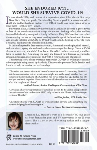 She Endured 9/11 . . . Would She Survive COVID-19? It was March 2020, and rumors of a mysterious virus filled the air. But busy New York City tour guide Christina Ray Stanton paid little attention. After all, she and her husband had survived 9/11; it would take more than a virus to slow them--or their city--down. But within days, Stanton saw her beloved Manhattan become a ghost town as fear of the novel coronavirus swept the nation. Seeking safety, she and her husband left the city to stay with family in Florida. They didn't realize that rather than escaping the storm, they were heading into the eye of the hurricane: Stanton was already infected with COVID-19 and would soon be fighting for her life from a hospital bed hundreds of miles from home. In this unforgettable first-person account, Stanton shares the physical, mental and emotional agony she endured as the virus ravaged her body. Given a 50/50 chance of survival, she didn't lose hope. She relied on her community and her faith to sustain her through the painful journey. Along the way, she learned new lessons in gratitude, emerging stronger, more resilient, and with a renewed sense of purpose. This stirring story of one woman's battle with COVID-19 will inspire anyone whose life has been touched by the coronavirus pandemic or who has endured hardship. Discover the power of faith, family and friends to help us survive our darkest days.