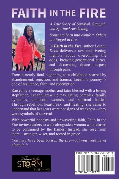 A True Story of Survival, Strength, and Spiritual Awakening Some are born into comfort. Others are forged in fire. In Faith in the Fire, author Leeann Deon delivers a raw and riveting memoir about overcoming the odds, breaking generational curses, and discovering divine purpose through pain. From a nearly fatal beginning to a childhood scarred by abandonment, rejection, and trauma, Leeann's journey is one of resilience, faith, and redemption. Raised by a teenage mother and later blessed with a loving stepfather, Leeann grew up navigating complex family dynamics, emotional wounds, and spiritual battles. Through rebellion, heartbreak, and healing, she came to understand that her scars were not signs of weakness-they were symbols of survival. With powerful honesty and unwavering faith, Faith in the Fire invites readers to walk alongside a woman who refused to be consumed by the flames. Instead, she rose from them-stronger, wiser, and rooted in grace. You may have been born in the fire-but you were never alone in it.