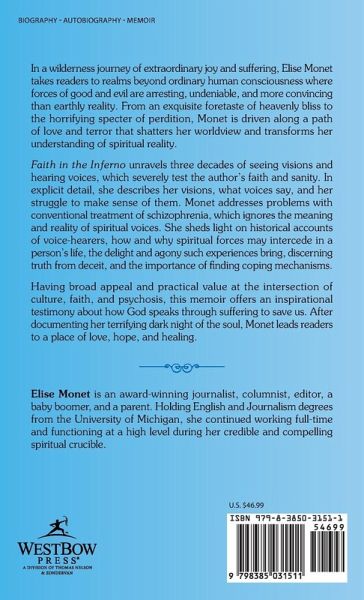 In a wilderness journey of extraordinary joy and suffering, Elise Monet takes readers to realms beyond ordinary human consciousness where forces of good and evil are arresting, undeniable, and more convincing than earthly reality. From an exquisite foretaste of heavenly bliss to the horrifying specter of perdition, Monet is driven along a path of love and terror that shatters her worldview and transforms her understanding of spiritual reality. Faith in the Inferno unravels three decades of seeing visions and hearing voices, which severely test the author's faith and sanity. In explicit detail, she describes her visions, what voices say, and her struggle to make sense of them. Monet addresses problems with conventional treatment of schizophrenia, which ignores the meaning and reality of spiritual voices. She sheds light on historical accounts of voice-hearers, how and why spiritual forces may intercede in a person's life, the delight and agony such experiences bring, discerning truth from deceit, and the importance of finding coping mechanisms. Having broad appeal and practical value at the intersection of culture, faith, and psychosis, this memoir offers an inspirational testimony about how God speaks through suffering to save us. After documenting her terrifying dark night of the soul, Monet leads readers to a place of love, hope, and healing.