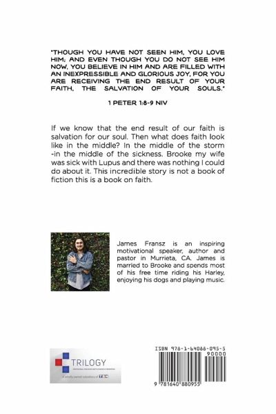 If we know that the end result of our faith is the salvation of our soul. Then what does faith look like in the middle? In the middle of the storm, in the middle of sickness. Brooke my wife was sick with Lupus and there was nothing I could do about it. This incredible book is not a book of fiction, this is a book on faith!