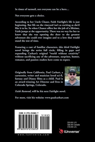 In times of turmoil, not everyone can be a hero... Not everyone gets a choice. According to her Uncle Chaser, Faith Fairlight's life is just beginning. But life on the vineyard isn't as exciting as she'd like it to be. So when Chance offers her the job of a lifetime, Faith jumps at the opportunity. There was no way for her to know that she was opening the door to the greatest adventure she could ever imagine and to a love that would stand the test of time. Featuring a cast of familiar characters, this third Fairlight novel brings the series full circle, filling in gaps and expanding Carhart's original "world without creativity" without sacrificing any of the adventure, surprises, romance and passion readers have come to expect.