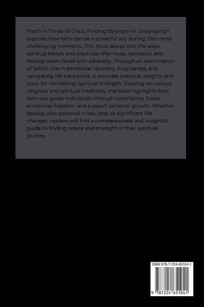 *Faith in Times of Crisis: Finding Strength in Uncertainty* explores how faith can be a powerful ally during life's most challenging moments. This book delves into the ways spiritual beliefs and practices offer hope, resilience, and healing when faced with adversity. Through an examination of faith's role in emotional recovery, forgiveness, and navigating life transitions, it provides practical insights and tools for harnessing spiritual strength. Drawing on various religious and spiritual traditions, the book highlights how faith can guide individuals through uncertainty, foster emotional freedom, and support personal growth. Whether dealing with personal crises, loss, or significant life changes, readers will find a compassionate and insightful guide to finding solace and strength in their spiritual journey.