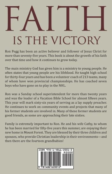 Ron Pegg has been an active believer and follower of Jesus Christ for more than seventy-five years. This book is about the growth of his faith over that time and how it continues to grow today. The main ministry God has given him is a ministry to young people. He often states that young people are his lifeblood. He taught high school for thirty-four years and has been a volunteer coach of 213 teams, many of whom have won provincial championships. He has coached seven boys who have gone on to play in the NHL. Ron was a Sunday school superintendent for more than twenty years and was the leader of a Vacation Bible School for almost fifteen years. This year will mark sixty-six years of serving as a lay supply preacher. He continues to work on community events and projects that many of his former students are involved in. Many of these former students are good friends, as some are approaching their late sixties. Family is extremely important to Ron. He and his wife Cathy, to whom he has been married for fifty-five years this summer, are enjoying their new home in Mount Forest. They are blessed by their three children and spouses, who provide Christian leadership in their environments-and then there are the fourteen grandbabies!