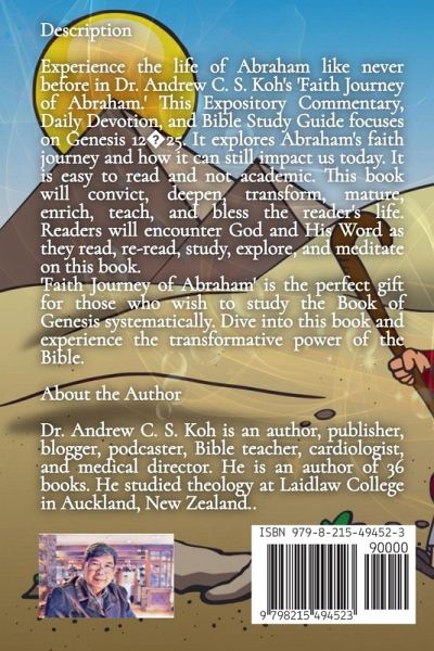 Experience the life of Abraham like never before in Dr. Andrew C. S. Koh's Faith Journey of Abraham. This Expository Commentary, Daily Devotion, and Bible Study Guide focuses on Genesis 12-25. It explores Abraham's faith journey and how it can still impact us today. It is easy to read and not academic. This book will convict, deepen, transform, mature, enrich, teach, and bless the reader's life. Readers will encounter God and His Word as they read, re-read, study, explore, and meditate on this book. The Faith Journey of Abraham is the perfect gift for those who wish to study the Book of Genesis systematically. It is comparable to other popular religion books such as Max Lucado's God's Story Your Story and John Ortberg's Who Is This Man? Experience the transformative power of the faith of Abraham.
