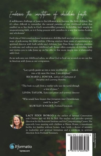 Embrace the invitation of childlike faith. A well-known challenge of Jesus to his followers is to become like little children. But it's often difficult to remember the natural patterns of our childhood selves that enabled us to live freely in God's wonder-filled presence. Is childlike faith simply an unquestioning faith, or is it being present with ourselves in a way that invites healing and wholeness? Faith Like a Child considers Jesus' invitation to childlike faith and explores seven distinct ways of welcoming the child within. Offering wisdom from years of experience as a spiritual director with both adults and children, Lacy Finn Borgo explores practices to welcome and enliven your childhood self. Offering examples of what becoming like children could look like, Borgo invites you to take Jesus up on his offer to live more deeply into a relationship with God. As we welcome our childhood selves, we allow God to heal our wounds so we can live in freedom with Jesus as our companion.