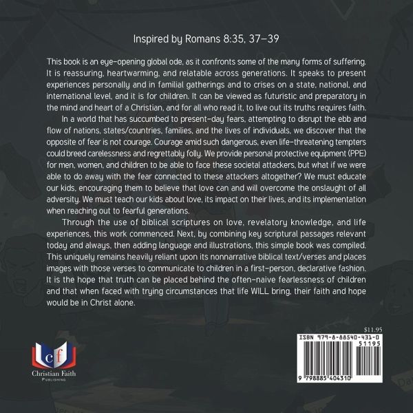 Inspired by Romans 8:35, 37-39 This book is an eye-opening global ode, as it confronts some of the many forms of suffering. It is reassuring, heartwarming, and relatable across generations. It speaks to present experiences personally and in familial gatherings and to crises on a state, national, and international level, and it is for children. It can be viewed as futuristic and preparatory in the mind and heart of a Christian, and for all who read it, to live out its truths requires faith. In a world that has succumbed to present-day fears, attempting to disrupt the ebb and flow of nations, states/countries, families, and the lives of individuals, we discover that the opposite of fear is not courage. Courage amid such dangerous, even life-threatening tempters could breed carelessness and regrettably folly. We provide personal protective equipment (PPE) for men, women, and children to be able to face these societal attackers, but what if we were able to do away with the fear connected to these attackers altogether? We must educate our kids, encouraging them to believe that love can and will overcome the onslaught of all adversity. We must teach our kids about love, its impact on their lives, and its implementation when reaching out to fearful generations. Through the use of biblical scriptures on love, revelatory knowledge, and life experiences, this work commenced. Next, by combining key scriptural passages relevant today and always, then adding language and illustrations, this simple book was compiled. This uniquely remains heavily reliant upon its nonnarrative biblical text/verses and places images with those verses to communicate to children in a first-person, declarative fashion. It is the hope that truth can be placed behind the often-naive fearlessness of children and that when faced with trying circumstances that life will bring, their faith and hope would be in Christ alone.