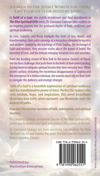 In Faith of a Soul, the eighth installment and final installment in The Nine Spiritual Gifts series, Dr. Constance Santego takes readers on an inspiring journey into the profound depths of faith, resilience, and spiritual awakening. As Lexi, Isabella, and Kesia navigate the trials of loss, doubt, and transformation, their paths converge at a monastery shrouded in mystery and wisdom. Guided by the teachings of Pistis Sophia, the Archangel of Faith and Wisdom, they uncover truths about the power of belief, the necessity of trust, and the delicate interplay between love and surrender. From the bustling streets of New York to the serene cloisters of Nepal, the trio faces challenges that push them to the limits of their understanding, forcing them to integrate spiritual lessons into their everyday lives. When secrets surface, including the mysterious disappearance of Sophea and the emergence of a hidden talisman, the women must rely on their faith to navigate the darkness and emerge stronger. Faith of a Soul is a heartfelt exploration of spiritual resilience and the transformative power of trust. Perfect for readers who seek wisdom, hope, and inspiration, this novel beautifully illustrates how faith, when nurtured, can illuminate even the darkest of paths. Step into this moving narrative of faith, redemption, and spiritual mastery.