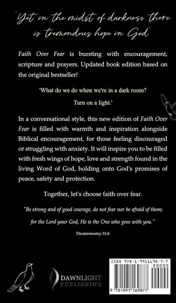 'Yet in the midst of great darkness there is tremendous hope in God' Faith Over Fear: Find Hope in the Midst of a Pandemic is bursting with encouragement, scripture, and prayers. Updated edition based on the original bestseller! In a conversational style, this new edition of Faith Over Fear is lit up with warmth to inspire you to hold onto faith and hope during this pandemic. It is a great resource of Biblical encouragement for those struggling with fear and anxiety. It will inspire you to be filled with fresh wings of hope, love and strength found in the Word of God - holding onto God's promises of peace, safety and protection.Your word is a lamp to guide my feet and a light for my path. Psalm 119: 105God is our refuge and strength, a very present help in trouble. Psalm 46:1Quote: 'Through our darkest night can shine the brightest light. Hope has a name. That name is Jesus.' Pick up a copy for you and a loved one today!Also available:*Faith Over Fear: Find Hope in the Midst of a Pandemic: Testimony and Journal edition*Faith Over Fear: Companion Notebook (for extended journaling)*Faith Over Fear: Bible Study Group edition*Faith Over Fear: YOUTH edition