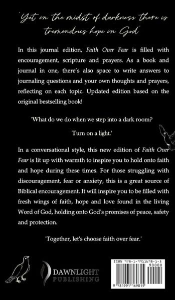 'Yet in the midst of great darkness there is tremendous hope in God.' In this new journal edition, Faith Over Fear is filled with encouragement, scripture and prayers. As a book and journal in one there's space to write your own thoughts and prayers alongside each chapter topic. Updated edition based on the original bestseller! In a conversational style, this new edition of Faith Over Fear is lit up with warmth to inspire you to hold onto faith and hope during this pandemic. For those struggling with discouragement, fear or anxiety, it is a great resource of Biblical encouragement. It will inspire you to be filled with hope and love by the Word of God - holding onto God's promises of peace, safety and protection. Quote: 'What's the first thing we do when we step into a dark room? We turn on a light. We need light in dark times to see where to go, and light gives us this direction.'Your word is a lamp to guide my feet and a light for my path. Psalm 119: 105God is our refuge and strength, a very present help in trouble. Psalm 46:1 KJVQuote: 'Through our darkest night can shine the brightest light. Hope has a name. That name is Jesus.'Pick up a copy for you and a loved one today!Also available:*Faith Over Fear: Find Hope in the Midst of a Pandemic (book edition)*Faith Over Fear: Companion Notebook (for extended journaling)*Faith Over Fear: Bible Study Group edition