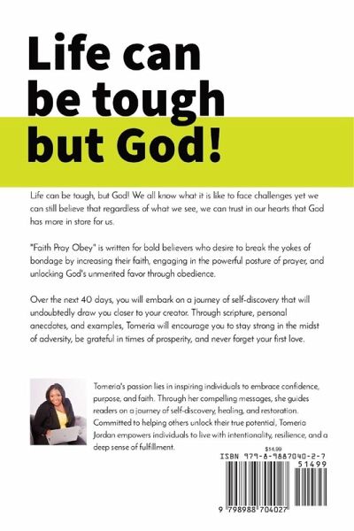Life can be tough, but God! We all know what it is like to face challenges yet still believe that regardless of what we see, we can trust in our hearts that God has more in store for us. "Faith Pray Obey" is written for bold believers who desire to break the yokes of bondage by increasing their faith, engaging in the powerful posture of prayer, and unlocking God's unmerited favor through obedience. Over the next 40 days, you will embark on a journey of self-discovery that will undoubtedly draw you closer to your creator. Through scripture, personal anecdotes and examples, Tomeria will encourage you to stay strong in the midst of adversity, be grateful in times of prosperity, and never forget your first love.