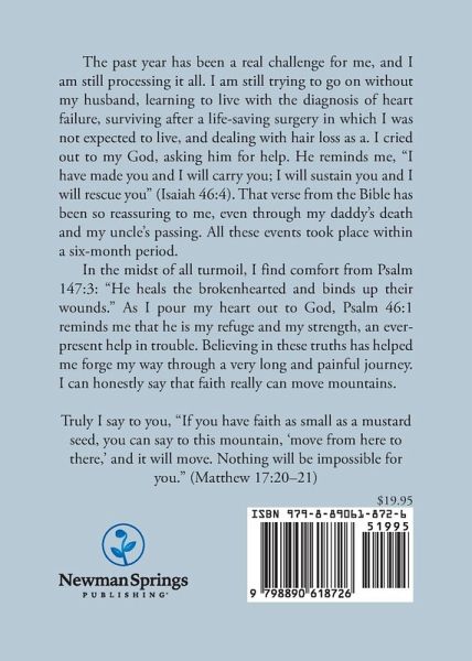 The past year has been a real challenge for me, and I am still processing it all. I am still trying to go on without my husband, learning to live with the diagnosis of heart failure, surviving after a life-saving surgery in which I was not expected to live, and dealing with hair loss as a. I cried out to my God, asking him for help. He reminds me, "I have made you and I will carry you; I will sustain you and I will rescue you" (Isaiah 46:4). That verse from the Bible has been so reassuring to me, even through my daddy's death and my uncle's passing. All these events took place within a six-month period. In the midst of all turmoil, I find comfort from Psalm 147:3: "He heals the brokenhearted and binds up their wounds." As I pour my heart out to God, Psalm 46:1 reminds me that he is my refuge and my strength, an ever-present help in trouble. Believing in these truths has helped me forge my way through a very long and painful journey. I can honestly say that faith really can move mountains. Truly I say to you, "If you have faith as small as a mustard seed, you can say to this mountain, 'move from here to there,' and it will move. Nothing will be impossible for you." (Matthew 17:20-21)