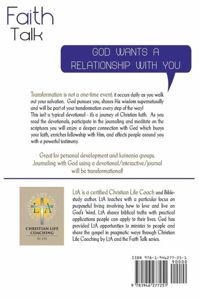 Transformation is not a one-time event; it occurs daily as you walk out your salvation. God pursues you, shares His wisdom supernaturally, and will be part of your transformation every step of the way! This isn't a typical devotional - it's a journey of Christian faith. As you read the devotionals, participate in the journaling and meditate on the scriptures you will enjoy a deeper connection with God which buoys your faith, enriches fellowship with Him, and affects people around you with a powerful testimony. Great for personal development and koinonia groups. Journaling with God using a devotional/interactive journal will be transformational! "Having a Christian Life Coach walk you through life's struggles has been such a gift to me and everyone around me. LtA helps guide you in order for the Holy Spirit to bring revelation into your heart. I have never had so much fun reading the Bible before! You will only benefit from spending time in the Word, and with a guided tour by LtA, that time will be well spent." Laura R., Columbia, MO.
