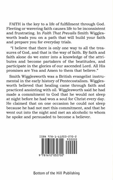 FAITH is the key to a life of fulfillment through God. Fleeting or wavering faith causes life to be inconsistent and frustrating. In Faith That Prevails Smith Wigglesworth leads you on a path that will build your faith and prepare you for everyday trials. "I believe that there is only one way to all the treasures of God, and that is the way of faith. By faith and faith alone do we enter into a knowledge of the attributes and become partakers of the beatitudes, and participate in the glories of our ascended Lord. All His promises are Yea and Amen to them that believe." Smith Wigglesworth was a British evangelist instrumental in the early history of Pentecostalism. Wigglesworth believed that healing came through faith and practiced anointing with oil. Wigglesworth said he had made a commitment to God that he would not sleep at night before he had won a soul for Christ every day. He claimed that on one occasion he could not sleep because he had not met this commitment, and that he went out into the night and met an alcoholic to whom he spoke and persuaded to become a believer.