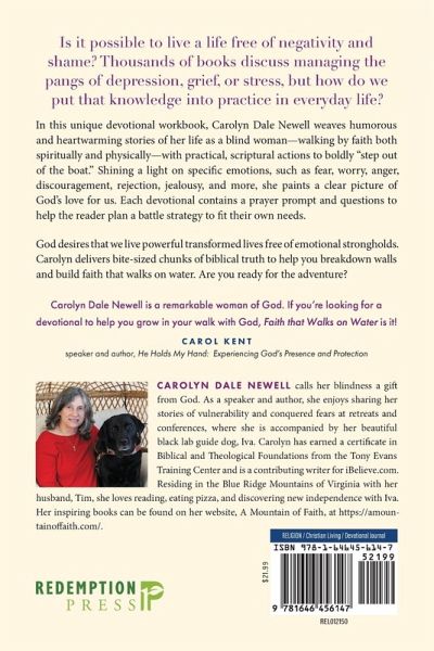 Is it possible to live a life free of negativity and shame? Thousands of books discuss managing the pangs of depression, grief, or stress, but how do we put that knowledge into practice in everyday life? In this unique devotional workbook, Carolyn Dale Newell weaves humorous and heartwarming stories of her life as a blind woman-walking by faith both spiritually and physically-with practical, scriptural actions to boldly "step out of the boat." Shining a light on specific emotions, such as fear, worry, anger, discouragement, rejection, jealousy, and more, she paints a clear picture of God's love for us. Each devotional contains a prayer prompt and questions to help the reader plan a battle strategy to fit their own needs. God desires that we live powerful transformed lives free of emotional strongholds. Carolyn delivers bite-sized chunks of biblical truth to help you breakdown walls and build faith that walks on water. Are you ready for the adventure? Carolyn Dale Newell is a remarkable woman of God. If you're looking for a devotional to help you grow in your walk with God, Faith that Walks on Water is it! Carol Kent speaker and author, He Holds My Hand:¿ Experiencing God's Presence and Protection