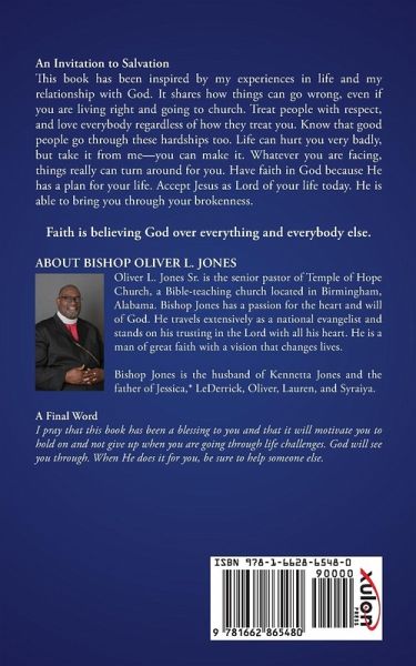 An Invitation to Salvation This book has been inspired by my experiences in life and my relationship with God. It shares how things can go wrong, even if you are living right and going to church. Treat people with respect, and love everybody regardless of how they treat you. Know that good people go through these hardships too. Life can hurt you very badly, but take it from me-you can make it. Whatever you are facing, things really can turn around for you. Have faith in God because He has a plan for your life. Accept Jesus as Lord of your life today. He is able to bring you through your brokenness. Faith is believing God over everything and everybody else. ABOUT BISHOP OLIVER L. JONES Oliver L. Jones Sr. is the senior pastor of Temple of Hope Church, a Bible-teaching church located in Birmingham, Alabama. Bishop Jones has a passion for the heart and will of God. He travels extensively as a national evangelist and stands on his trusting in the Lord with all his heart. He is a man of great faith with a vision that changes lives. Bishop Jones is the husband of Kennetta Jones and the father of Jessica, * LeDerrick, Oliver, Lauren, and Syraiya. A Final Word I pray that this book has been a blessing to you and that it will motivate you to hold on and not give up when you are going through life challenges. God will see you through. When He does it for you, be sure to help someone else.