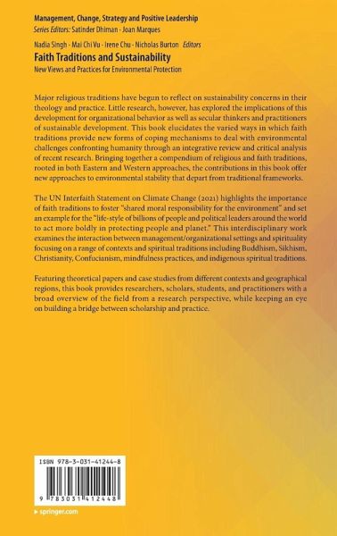 Major religious traditions have begun to reflect on sustainability concerns in their theology and practice. Little research, however, has explored the implications of this development for organizational behavior as well as secular thinkers and practitioners of sustainable development. This book elucidates the varied ways in which faith traditions provide new forms of coping mechanisms to deal with environmental challenges confronting humanity through an integrative review and critical analysis of recent research. Bringing together a compendium of religious and faith traditions, rooted in both Eastern and Western approaches, the work provides a new perspective and presents alternative paradigms to deal with the contemporary ecological crises. The UN Interfaith Statement on Climate Change (2021) highlights the importance of faith traditions to foster "shared moral responsibility for the environment" and set an example for the "life-style of billions of people and political leaders around the world to act more boldly in protecting people and planet." This interdisciplinary work examines the interaction between management/organizational settings and spirituality focusing on a range of contexts and spiritual traditions including Buddhism, Sikhism, Christianity, Confucianism, mindfulness practices and indigenous spiritual traditions.