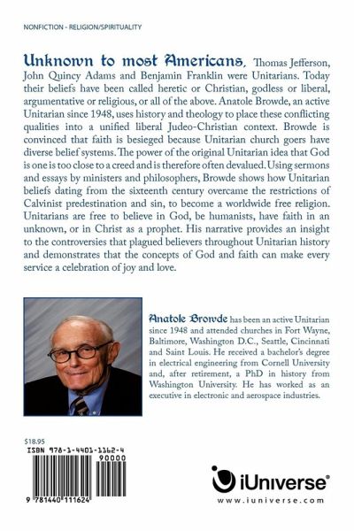 Unknown to most Americans, Thomas Jefferson, John Quincy Adams and Benjamin Franklin were Unitarians. Today their beliefs have been called heretic or Christian, godless or liberal, argumentative or religious, or all of the above. Anatole Browde, an active Unitarian since 1949, uses history and theology to place these conflicting qualities into a unified liberal Judeo-Christian context. Browde is convinced that faith is besieged because Unitarian church goers have diverse belief systems. The power of the original Unitarian idea that God is one is too close to a creed and is therefore often devalued. Using sermons and essays by ministers and philosophers, Browde shows how Unitarianism beliefs dating from the sixteenth century overcame the restrictions of Calvinist predestination and sin, to become a worldwide free religion. Unitarians are free to believe in God, be humanists, have faith in an unknown, or in Christ as a prophet. His narrative provides an insight to the controversies that plagued believers throughout Unitarian history and demonstrates that the concepts of God and faith can make every service a celebration of joy and love.