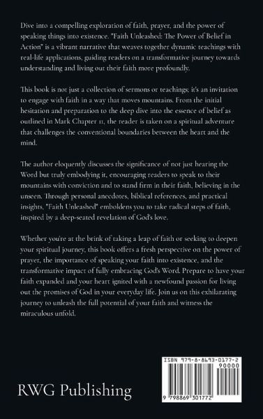 Dive into a compelling exploration of faith, prayer, and the power of speaking things into existence. "Faith Unleashed: The Power of Belief in Action" is a vibrant narrative that weaves together dynamic teachings with real-life applications, guiding readers on a transformative journey towards understanding and living out their faith more profoundly. This book is not just a collection of sermons or teachings; it's an invitation to engage with faith in a way that moves mountains. From the initial hesitation and preparation to the deep dive into the essence of belief as outlined in Mark Chapter 11, the reader is taken on a spiritual adventure that challenges the conventional boundaries between the heart and the mind. The author eloquently discusses the significance of not just hearing the Word but truly embodying it, encouraging readers to speak to their mountains with conviction and to stand firm in their faith, believing in the unseen. Through personal anecdotes, biblical references, and practical insights, "Faith Unleashed" emboldens you to take radical steps of faith, inspired by a deep-seated revelation of God's love. Whether you're at the brink of taking a leap of faith or seeking to deepen your spiritual journey, this book offers a fresh perspective on the power of prayer, the importance of speaking your faith into existence, and the transformative impact of fully embracing God's Word. Prepare to have your faith expanded and your heart ignited with a newfound passion for living out the promises of God in your everyday life. Join us on this exhilarating journey to unleash the full potential of your faith and witness the miraculous unfold.