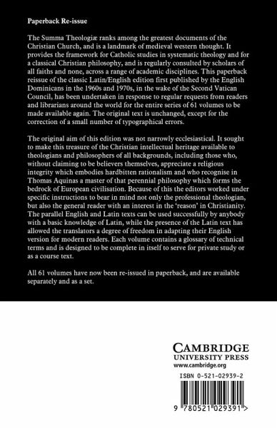 The Summa Theologiae ranks among the greatest documents of the Christian Church, and is a landmark of medieval western thought. It provides the framework for Catholic studies in systematic theology and for a classical Christian philosophy, and is regularly consulted by scholars of all faiths and none, across a range of academic disciplines. This paperback reissue of the classic Latin/English edition first published by the English Dominicans in the 1960s and 1970s, in the wake of the Second Vatican Council, has been undertaken in response to regular requests from readers and librarians around the world for the entire series of 61 volumes to be made available again. The original text is unchanged, except for the correction of a small number of typographical errors.
