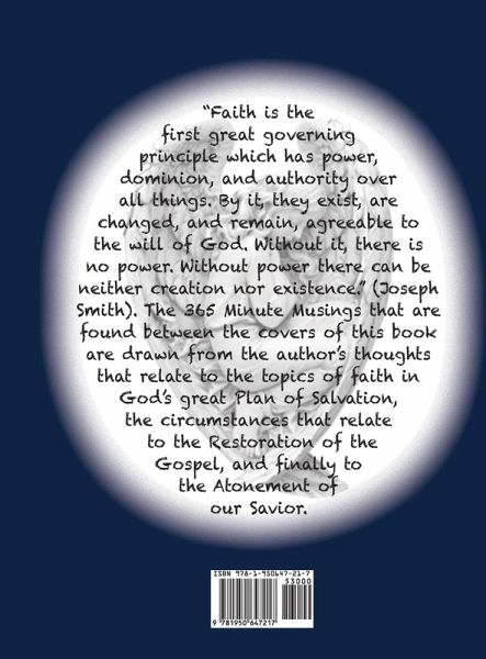 "Faith is the first great governing principle which has power, dominion, and authority over all things. By it, they exist, are changed, and remain, agreeable to the will of God. Without it, there is no power, and without power there could be no creation nor existence." (Joseph Smith). The 365 Minute Musings that are found within the covers of this book are drawn from the author’s thoughts that relate to this most important topic of faith.