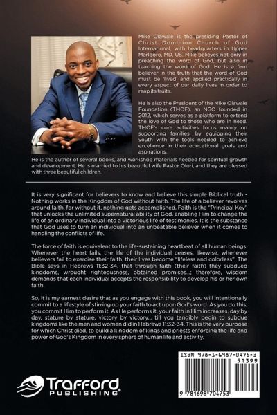 It is very significant for believers to know and believe this simple Biblical truth - Nothing works in the Kingdom of God without faith. The life of a believer revolves around faith, for without it, nothing gets accomplished. Faith is the "Principal Key" that unlocks the unlimited supernatural ability of God, enabling Him to change the life of an ordinary individual into a victorious life of testimonies. It is the substance that God uses to turn an individual into an unbeatable believer when it comes to handling the conflict of life. The force of faith is equivalent to the life-sustaining heartbeat of all human beings. Whenever the heart fails, the life of the individual ceases, likewise, whenever believers fail to exercise their faith, their lives become "lifeless and colorless". The Bible says in Hebrews 11:32-34, that through faith (their faith) they subdued kingdoms, wrought righteousness, obtained promises...; therefore, wisdom demands that each individual accepts the responsibility to develop his or her own faith. So, it is my earnest desire that as you engage with this book, you will intentionally commit to a lifestyle of stirring up your faith to act upon God's word. As you do it this, you commit Him to perform it. As He performs it, your faith in Him increases, day by day, stature by stature, victory by victory... till you tangibly begin to subdue kingdoms like the men and women did in Hebrews 11:32-34. This is the very purpose for which Christ died, to build a kingdom of kings and priests enforcing the life and power of God's Kingdom in every sphere of human life and activity.