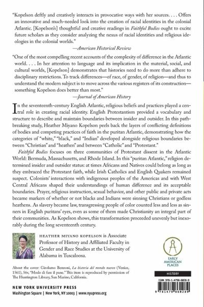 In the seventeenth-century English Atlantic, religious beliefs and practices played a central role in creating racial identity. English Protestantism provided a vocabulary and structure to describe and maintain boundaries between insider and outsider. In this path-breaking study, Heather Miyano Kopelson peels back the layers of conflicting definitions of bodies and competing practices of faith in the puritan Atlantic, demonstrating how the categories of "white," "black," and "Indian" developed alongside religious boundaries between "Christian" and "heathen" and between "Catholic" and "Protestant." Faithful Bodies focuses on three communities of Protestant dissent in the Atlantic World: Bermuda, Massachusetts, and Rhode Island. In this "puritan Atlantic," religion determined insider and outsider status: at times Africans and Natives could belong as long as they embraced the Protestant faith, while Irish Catholics and English Quakers remained suspect. Colonists' interactions with indigenous peoples of the Americas and with West Central Africans shaped their understandings of human difference and its acceptable boundaries. Prayer, religious instruction, sexual behavior, and other public and private acts became markers of whether or not blacks and Indians were sinning Christians or godless heathens. As slavery became law, transgressing people of color counted less and less as sinners in English puritans' eyes, even as some of them made Christianity an integral part of their communities. As Kopelson shows, this transformation proceeded unevenly but inexorably during the long seventeenth century.